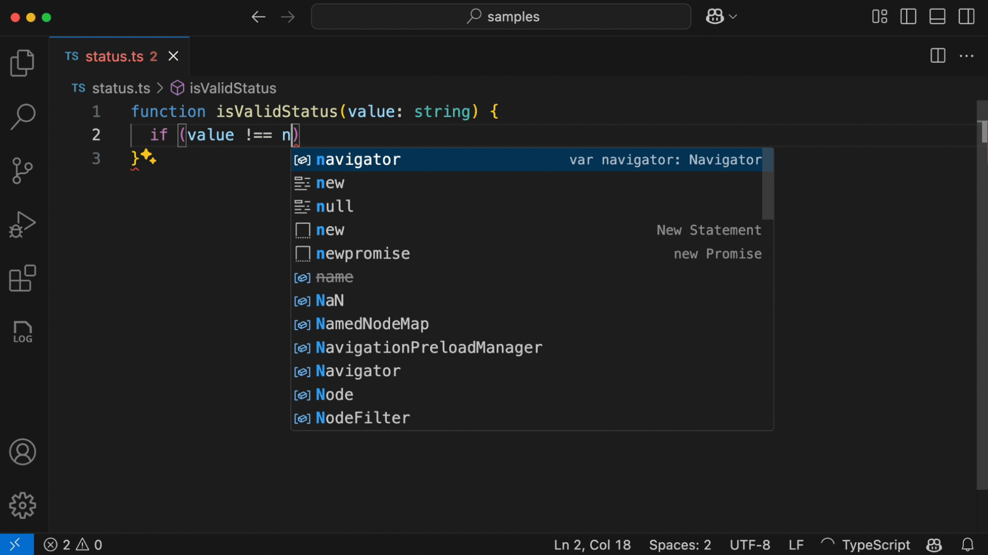 NES aide à corriger des erreurs simples comme les fautes de frappe. Il suggère des corrections lorsque des lettres sont manquantes ou inversées, par exemple cont x = 5 ou conts x = 5 au lieu de const x = 5.
