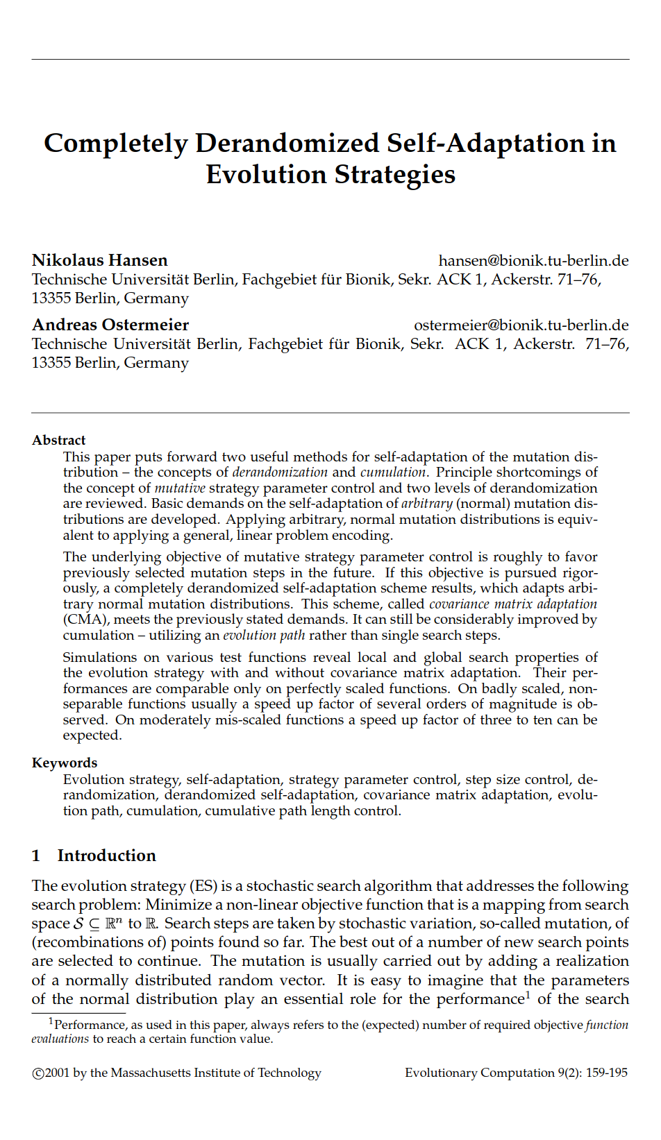 Hansen, N. and Ostermeier, A., 2001. Completely derandomized self-adaptation in evolution strategies. Evolutionary computation, 9(2), pp.159-195.