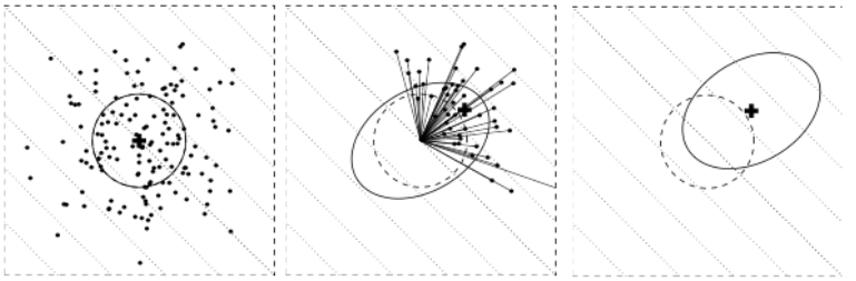 $\quad$ $\boldsymbol{C} \leftarrow (1 - c_1 - c_{\mu}) \boldsymbol{C} + c_1 \boldsymbol{p_c} \boldsymbol{p_c}^\top + c_{\mu} \sum_{i=1}^{\mu} w_i \boldsymbol{y}_{i:\lambda} \boldsymbol{y}_{i:\lambda}^\top$